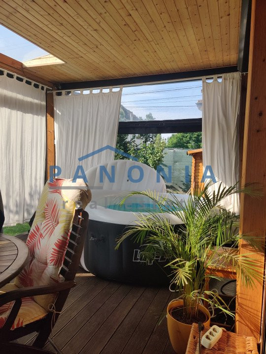 Designul interior este modern, iar suprafețele vitrate mari permit o priveliște spectaculoasă asupra grădinii cochete și mature, cu un peisaj încântător. La parter, veți găsi o zonă de zi primitoare și luminosă, cu un living spațios și o zonă de luat masa, oferind vederi minunate către grădină. Bucătăria este complet utilată și se află într-un spațiu separat, cu loc pentru a savura micul dejun într-un cadru plăcut. De asemenea, la parter există o baie, o cameră tehnică și o terasă cu acces din living, precum și o terasă acoperită, pentru a vă bucura de aerul curat în orice moment al zilei.